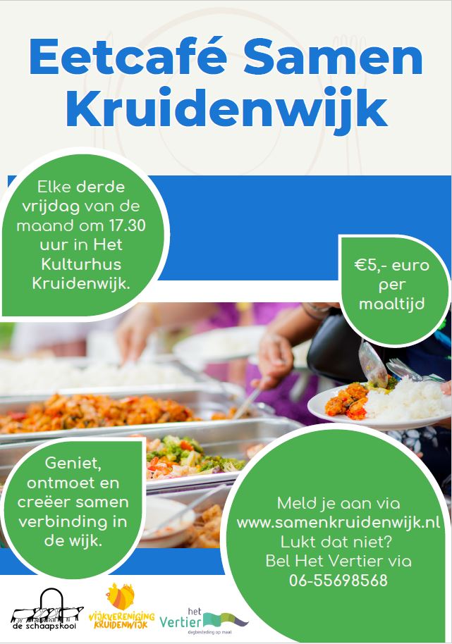 - Nog deze maand gaan we starten met een Eetcafé; een maandelijks terugkerend evenement waar bewoners van een gezellige en betaalbare maaltijd kunnen genieten. Meer informatie volgt binnenkort via de diverse media.