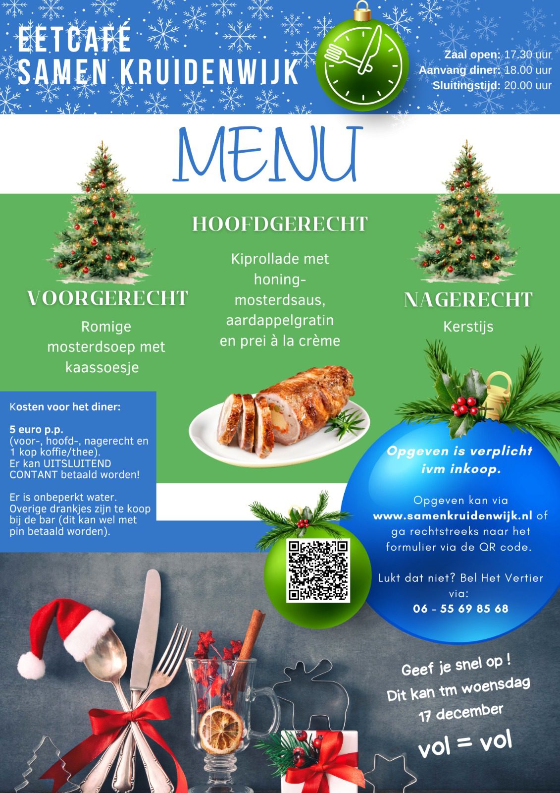 Op onze website Samen Kruidenwijk is meer informatie te vinden over het Eetcafé, u kunt zich daar ook opgeven via het online formulier (of scan de QR code in de menukaart). Ook kunt u daar het menu bekijken.