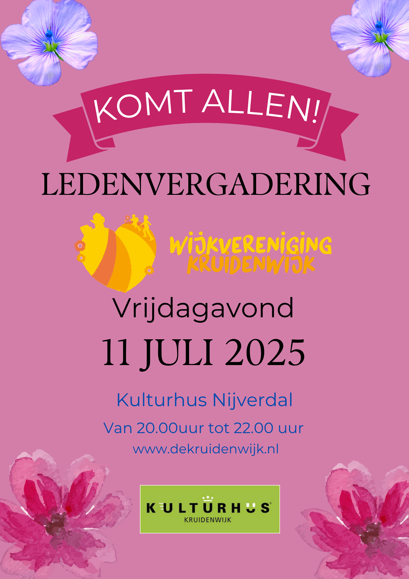 Ledenvergadering van wijkvereniging de Kruidenwijk – vrijdagavond 11 juli om 20.00 uur. Komt allen!